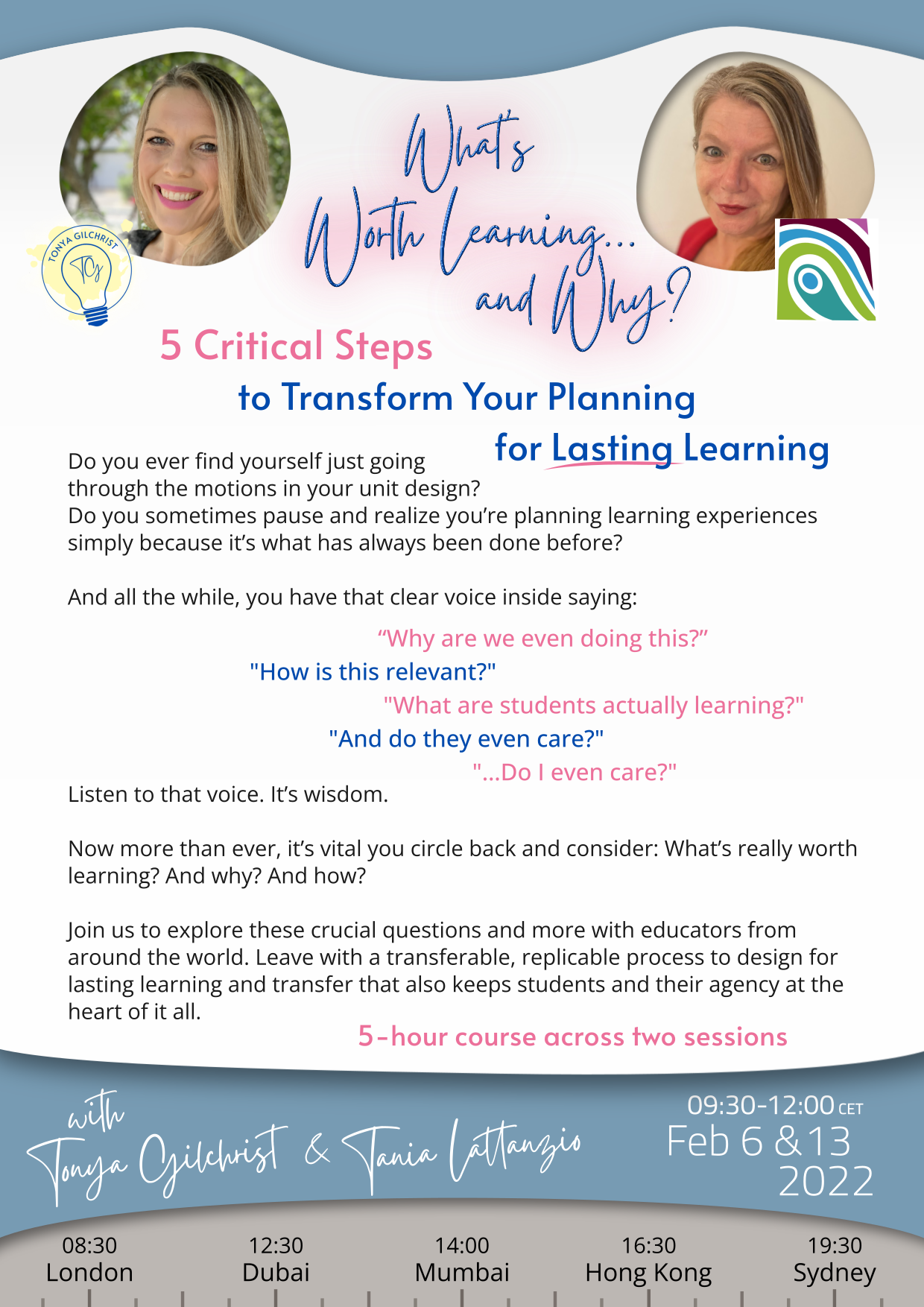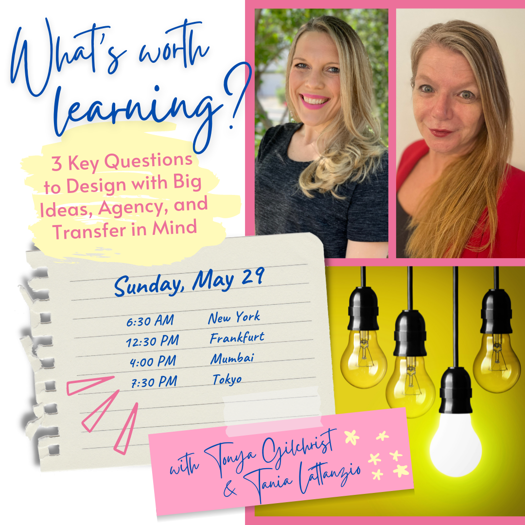 Join Tonya Gilchrist, Tania Lattanzio, and educators from around the world as we explore ways to keep the vital question What’s worth learning? as the consistent pulse in our instructional design and decision-making.